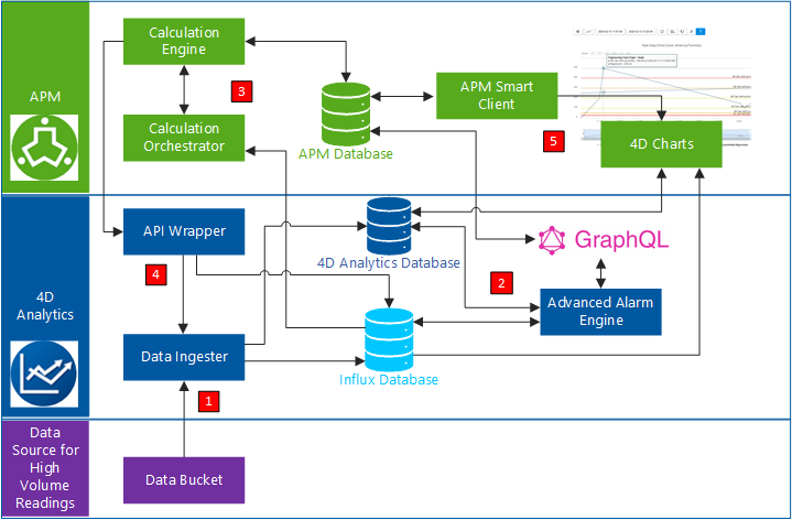 APM incorporates functionality from AssetWise 4D Analytics to process large datasets, like the readings that come from Industrial Internet of Things devices: interconnected sensors, instruments, and other devices throughout the plant. 4D Analytics makes it possible to ingest and process large volumes of indicator readings in a small amount of time. The readings are stored in a time series database (InfluxDB®) to preserve the sequential properties of the readings, for example, from oldest to newest reading based on their “Collected On” dates and times.Overview of the Components