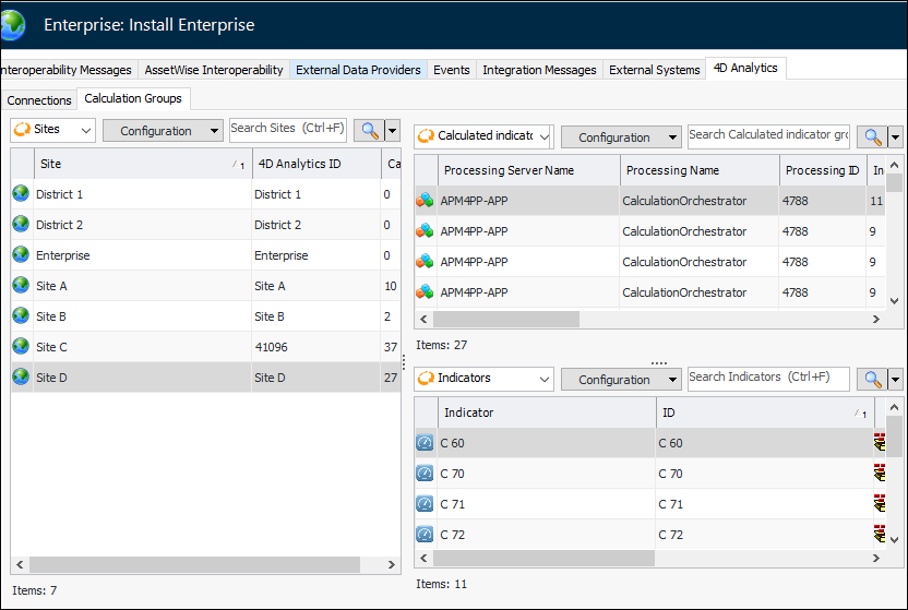You can view calculation groups in the Enterprise window, Integrations view, 4D Analytics tab, Calculation Groups tab. Groups are listed by site, along with processing information and indicators. Select a group to view its calculated indicators in the table below. For example:4D Indicators