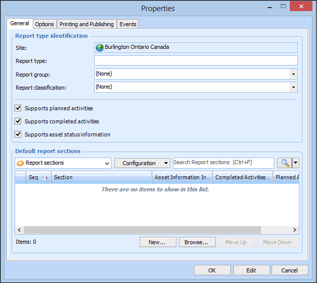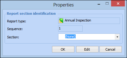 5. Click Browse to select from a list of pre-defined report section types, or click New to create a section type. The report section identification’s Properties dialog appears. For example:Tip: You can press F3 to create a new report section if a predefined section does not already exist. For more information on setting up an asset activity report section, see Setting up Asset Activity Report Section Types.