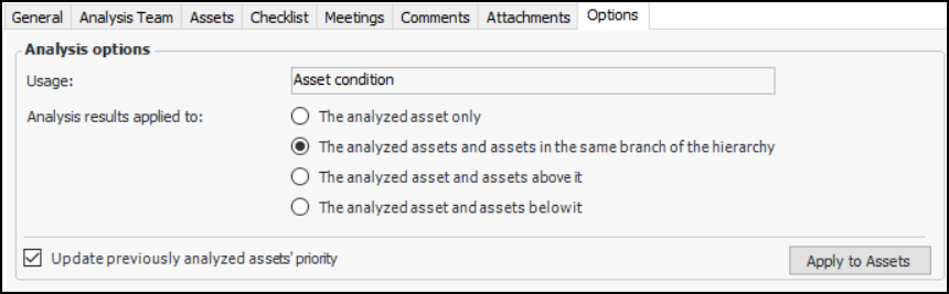 • The analyzed asset only – Only the assets included in the current analysis have their consequence priority numbers or conditions updated