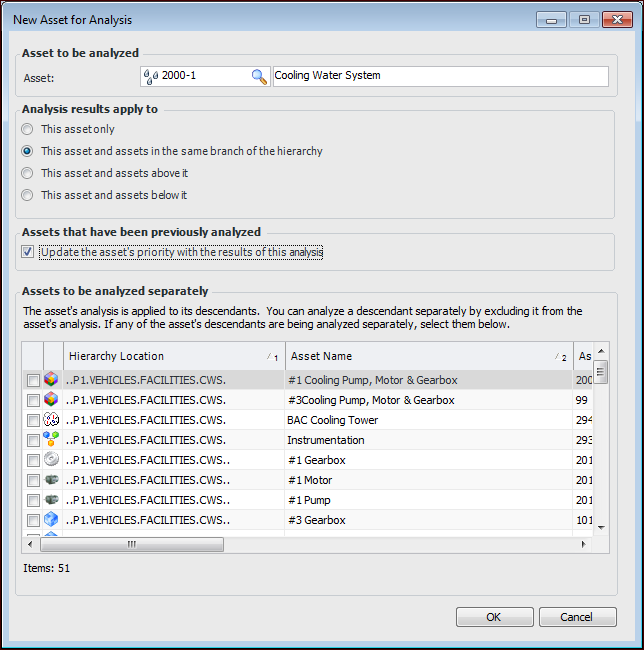 6. If Update the asset’s priority with the results of this analysis is selected, previously analyzed assets are updated when the results of the current analysis are applied. This option takes into account the selected Analysis results apply to option.Note: You can also perform this step after you have added the parent asset to the analysis. Double-click it in the Assets tab to open the Asset Analysis window. Select the Descendants tab, select the assets to analyze separately, and click OK.