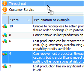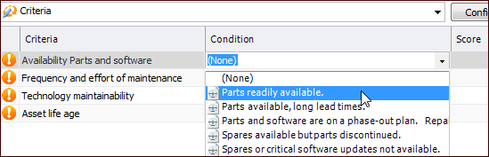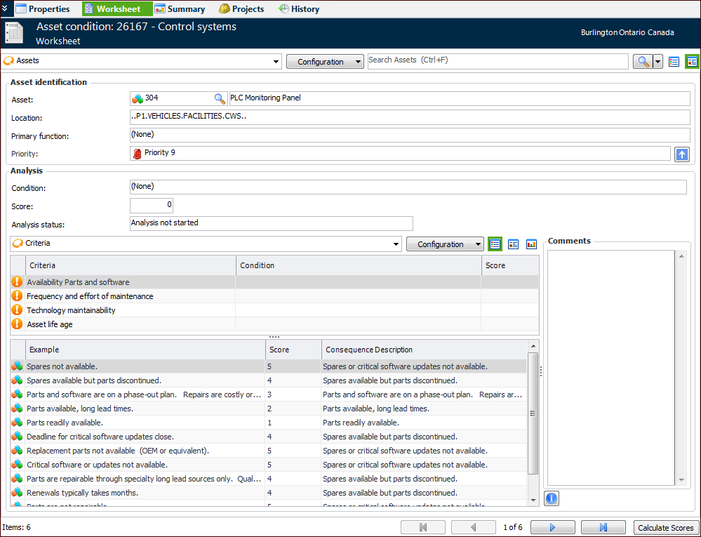 3. Select the Worksheet view. For example:Tip: You can also select the Properties view, Assets tab. Double-click the asset that you wish to analyze. You can then enter scores in the Analysis Asset window.Tip: When returning to an analysis to complete it, you can select the “Analysis incomplete” configuration in the Worksheet view. The display moves to the first asset for which criteria have not been analyzed.