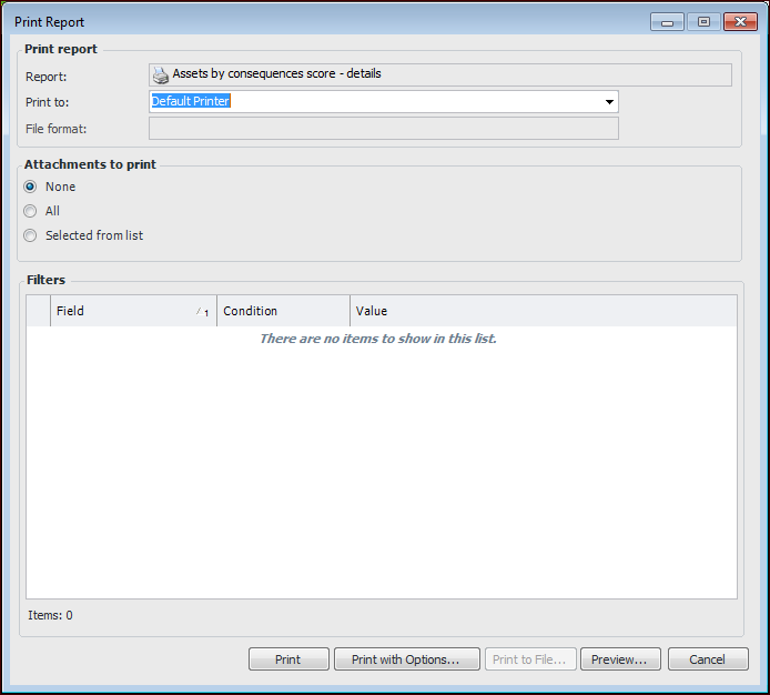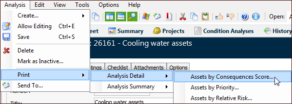 • Assets by Priority – Lists each asset from highest to lowest priority (condition) numberThis topic describes how to print analysis reports. For information about saving a report to a file, see Printing Documents.To Print Analysis Reports