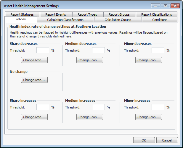 1. From the Site window, select the Administration menu, Asset Health Settings, and then Asset Health. The Asset Health Management Settings dialog appears.Tip: You can also select the Asset Health view, Settings tab, Asset Health tab, and then the Asset Health Settings node in the tree.