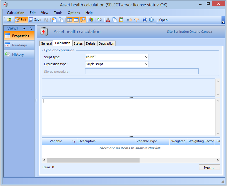 8. Select the States tab to add a state to the calculation. For more information, see Creating an Asset Health Calculation State.