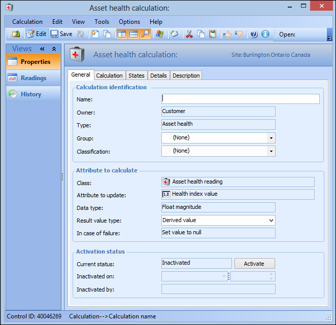 9. Select the Details tab to define calculation details. For more information, see Assigning Asset Health Calculation Details.