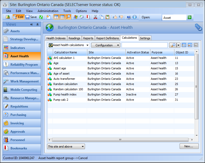 1. On the Site window, select the Asset Health view and then the Calculations tab. By default, this tab lists all asset health report calculations for this site and above.