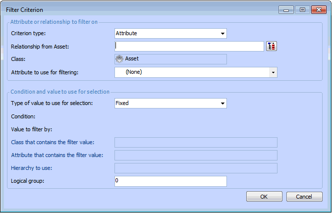 Every filter criterion starts from the class of objects that you want to select (for example, the Work Request class). You can then select either an attribute or a relationship to use to filter the objects. In most cases, you will base the filter on an attribute (property) of the base class. For example, you might filter a group of work requests based on the WorkRequestStatus attribute. However, you can also use an attribute owned by a related class.You can also filter a group of objects based on its relationship to another set of objects. For example, you might use the Work Request class’ Asset to work on relationship to select only requests for a specific asset or for a specific asset and its children. Criteria based on relationships are more complicated to create. For information about relationship-based filter criteria, see Creating a Filter Criterion Based on a Relationship.A variable filter allows you to filter a group of objects based on a variable value. The value used in the filter is only determined at the time the filter is used by looking up the current value of the selected attribute or relationship. A specific, fixed value cannot be selected. For example, you might want to filter employee names based on the name of the employee currently logged in, rather than a specific employee name.Note: Before you begin creating filter criteria, you should have a good understanding of APM object modeling and filtering concepts. For more information, see Object Model Overview and Selection Criteria Concepts for Asset Health Assets.To Create a Filter Criterion Based on an Attribute