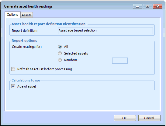 3. Select the Options tab, and then select whether to create readings for all assets, selected assets, or a random percentage of assets.