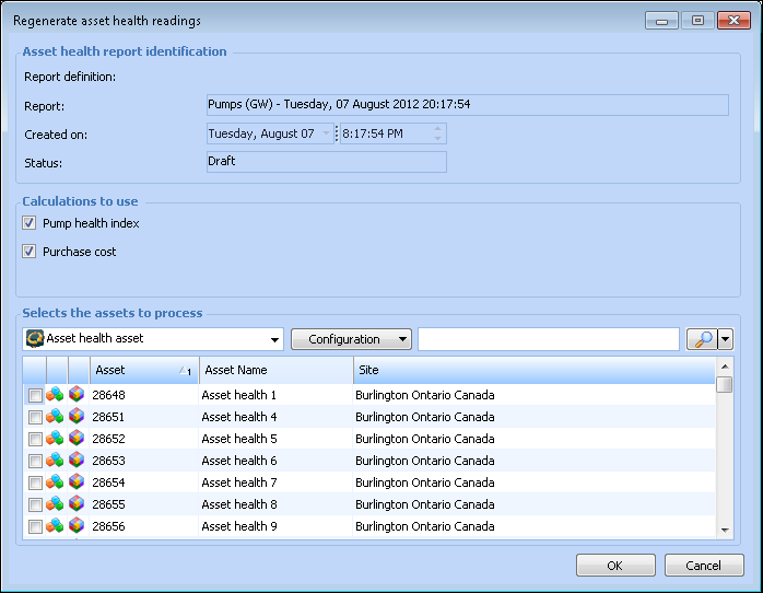 3. Double-click an asset health report, and select Tools, Regenerate Readings. The Regenerate Asset Health Readings dialog appears. For example: