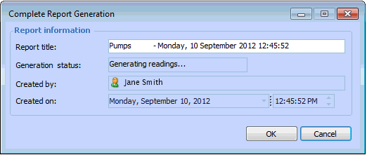 3. Double-click an asset health report for which readings could not be completed, and select Tools, Complete Generation. The Complete Report Generation dialog appears. For example: