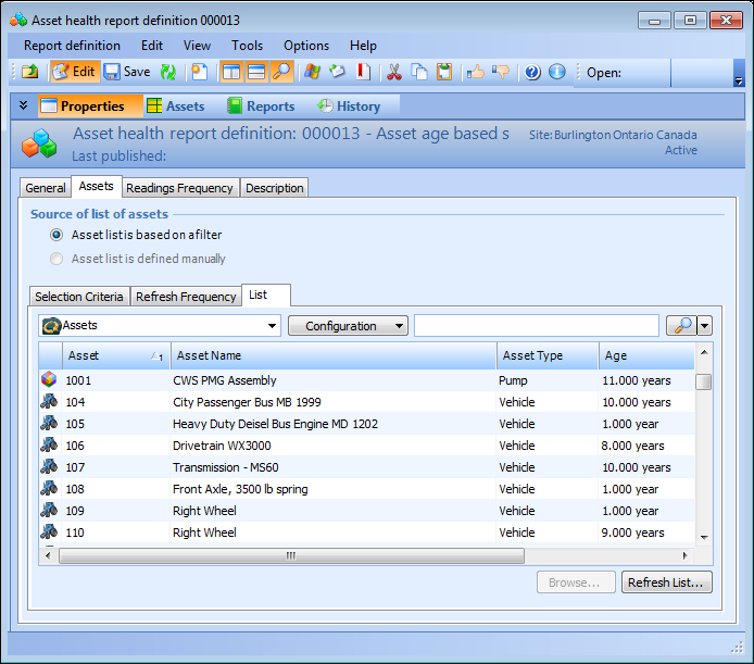 7. Select the Assets List tab to view the list of asset health assets currently in this asset health report definition.