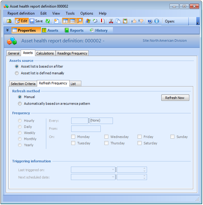Asset health assets can be refreshed using a scheduled action on the site. For more information, see Creating a Scheduled Action. Asset health assets can also be refreshed manually using the site’s Tools menu, Asset Health, Refresh Asset Health Assets option.To Select Assets for an Asset Health Report Definition