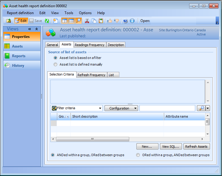 • Asset list is based on a filter: The assets for the asset health report are based on a filter. You must create a filter to determine which assets are used in the report, and define a refresh frequency for updating the list of assets. See Asset lists based on a filter.