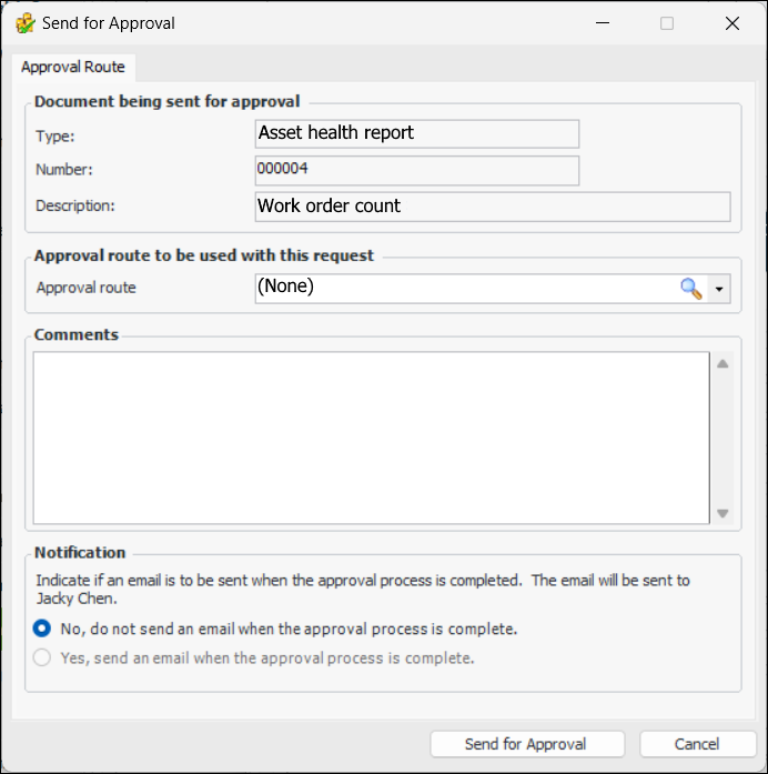 3. Click the Asset Health Report menu and then Send for Approval. The Send for Approval dialog is displayed.