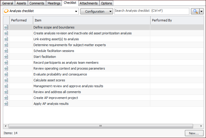 When recording an analysis, you can mark analysis checklist items as “Performed” and provide comments for them. APM records the employee who checked off the item, the date, and time. The analysis team can view the status of checklist items in the analysis window, Properties view, Checklist tab.For information about adding checklist items to the site’s Strategy Development settings, see Setting up Checklist Items for Strategy Development Analysis.To Mark a Checklist Item as Performed