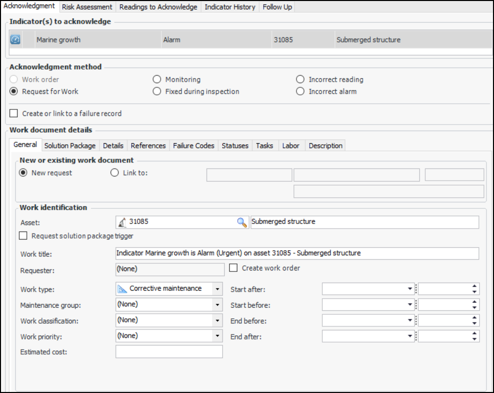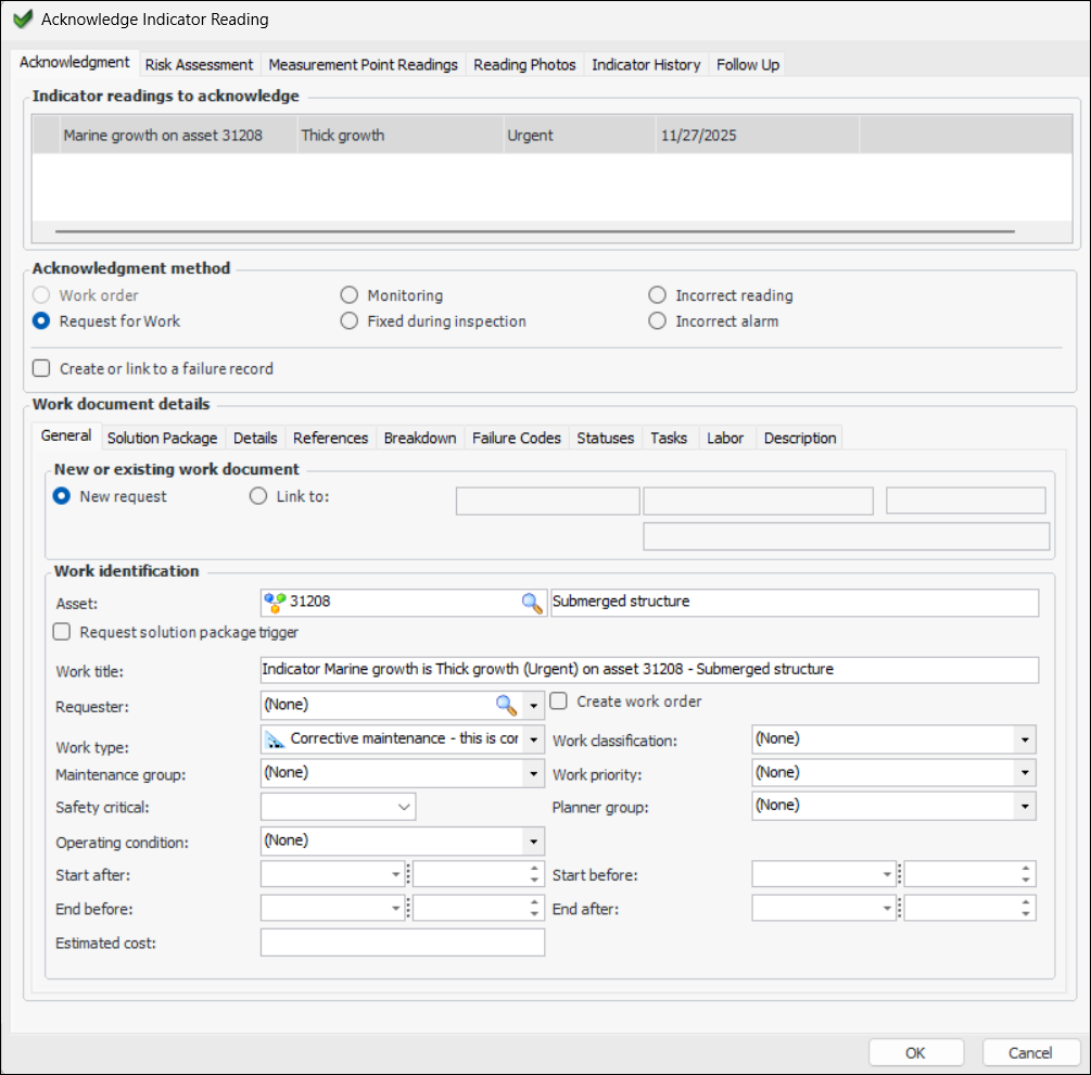 2. Click OK. APM closes the dialog, creates the required objects, and turns off the warning or alarm on the indicator.Tip: The request for work is listed in the Indicator Reading and Acknowledgment windows, as well as in the asset’s and site’s Work Management view.