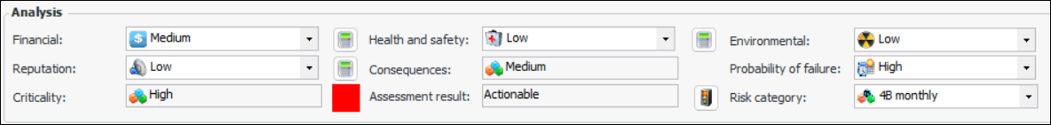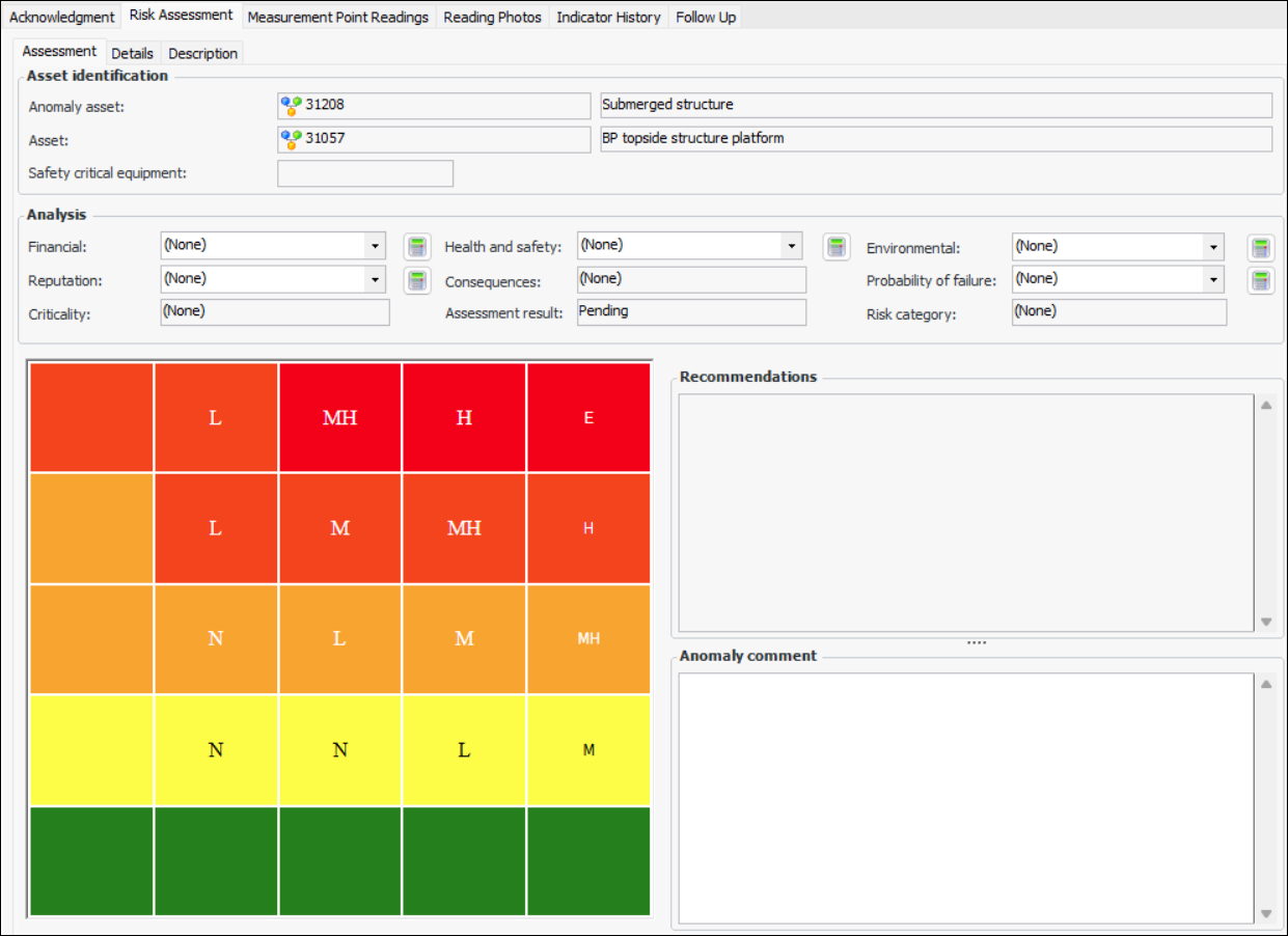 Note: Support for anomaly assessment is generally available. However, you must first enable feature 108 to use the functionality in APM. In the Enterprise window, select the Features view and the Enabled Features tab. Click Browse, select “Anomaly risk assessment” and click OK. If APM is running as a smart client, click Refresh Enabled Features on the server. Then restart the client to use the functionality.Note: The site’s risk assessment settings must require that risk be assessed for alarm acknowledgments. For related information about setting up anomaly risk assessment, see Anomaly Risk Assessment Settings.Note: Depending on settings in the anomaly risk assessment profile assigned to the site, some acknowledgment methods might not require risk assessment. For example, “Fixed during inspection” might not warrant a request for work, in which case, the Risk Assessment tab does not appear in the Acknowledge Indicator Alarm dialog.Tip: After creating an acknowledgment, you can view information about it in the site’s Inspection Management view, Readings tab, Acknowledgments tab. This tab lists the acknowledgments by date and includes columns for asset, indicator, reading date, indicator state, acknowledgment method, and status. Double-click an acknowledgment to open its dialog.Risk Assessment