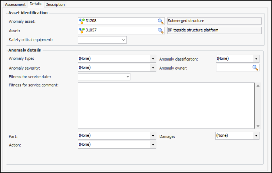 • Safety critical equipment – Indicates if the asset’s use involves risk (there is a potential that a mishap could occur, with severe consequences). If this property was set on the anomaly asset, the value is displayed