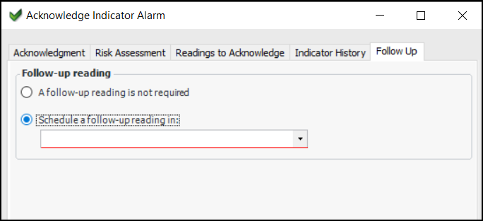 1. If you wish to request a follow-up reading, select the Follow Up tab and select Schedule a follow-up reading.Select a time period from the Follow up reading is required in list. The indicator’s collection due date changes to the date of the acknowledgment plus the follow-up time.Tip: To view the next collection due date in the Indicator window, select the Readings view and the Next Reading tab.To Complete the Acknowledgment