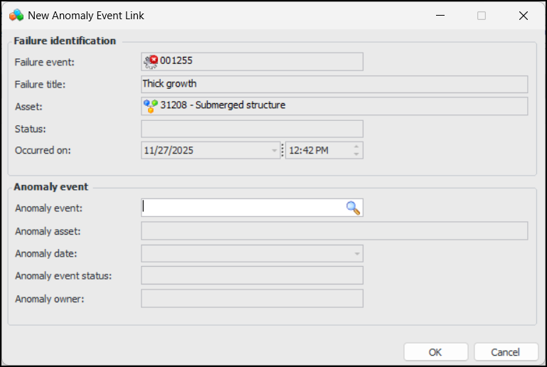 4. Select the Anomaly Events tab to view a list of the anomaly events associated with the failure. To link the failure to another anomaly, click New Link. The New Anomaly Event Link dialog appears: