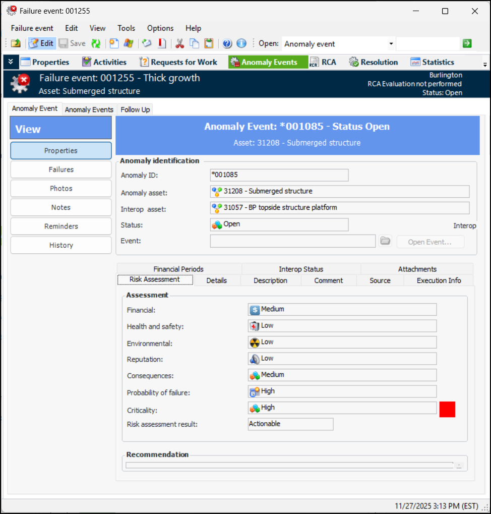When an anomaly event is created, a failure record is almost always created at the same time. The anomaly event is used to integrate with the AA&T system, while the failure event provides functionality not available in the AA&T system. The Anomaly Events view in the Failure Event window provides one location where you can add links to anomaly events and view information about anomaly events.To View a Failure Record’s Anomaly Events