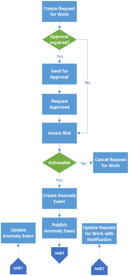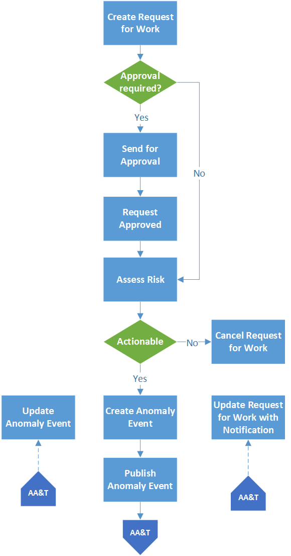Note: Depending on settings in the anomaly risk assessment profile assigned to the site, some acknowledgment methods might not require risk assessment. For example, “Fixed during inspection” might not warrant a request for work, in which case, the Risk Assessment tab does not appear in the Acknowledge Indicator Alarm dialog.Request for Work Process with Risk Assessment