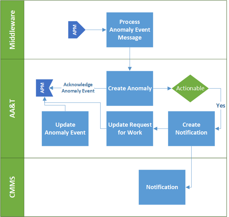 Tip: To view tables of anomaly events, in the Site or Asset window, select the Work Management view and the Anomaly Events tab.Note: Support for anomaly assessment is generally available. However, you must first enable feature 108 to use the functionality in APM. In the Enterprise window, select the Features view and the Enabled Features tab. Click Browse, select “Anomaly risk assessment” and click OK. If APM is running as a smart client, click Refresh Enabled Features on the server. Then restart the client to use the functionality.Alarm Acknowledgment Process with Risk Assessment