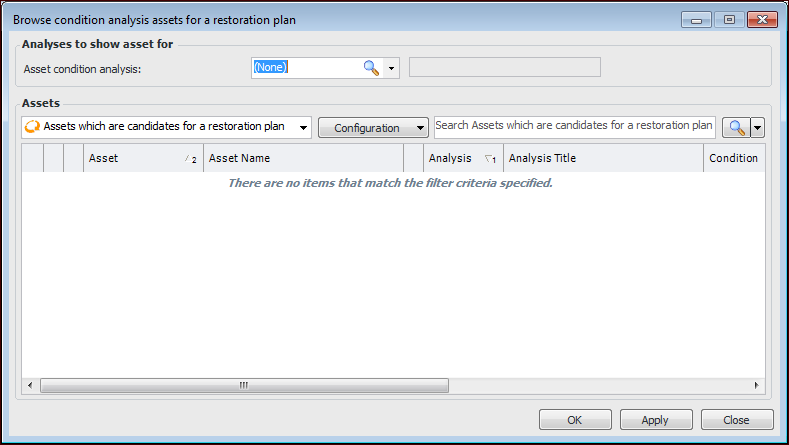 4. To add assets from an asset condition analysis, click the Browse list and then Analysis Assets. The Browse Condition Analysis Assets dialog appears: