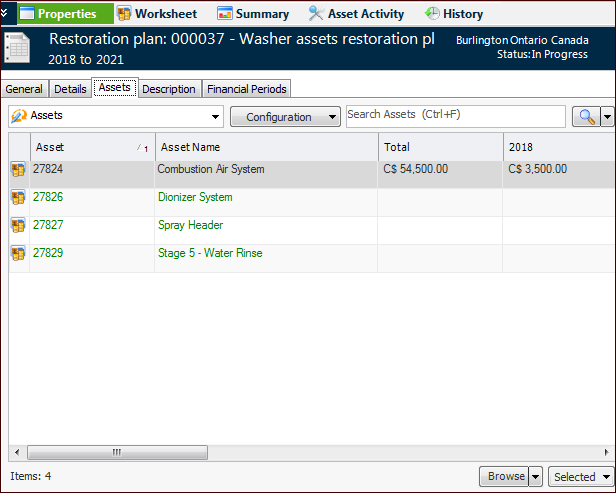 3. Select the Assets tab. This tab lists the assets, their spending plans, and identified work. For example: