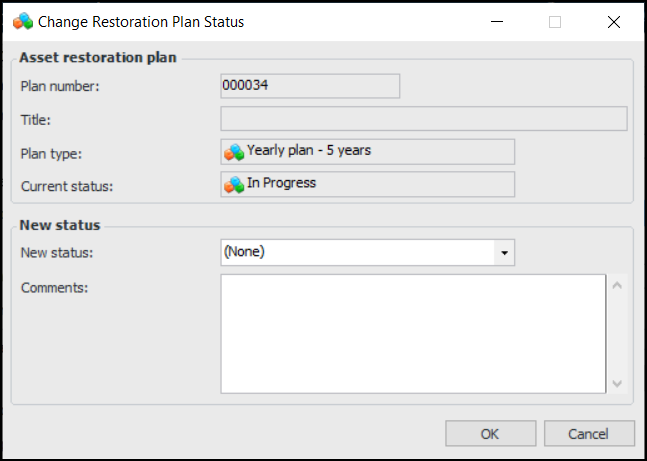 9. The plan status is read-only. When you wish to change the status, click Change Status. The Change Restoration Plan Status dialog appears: