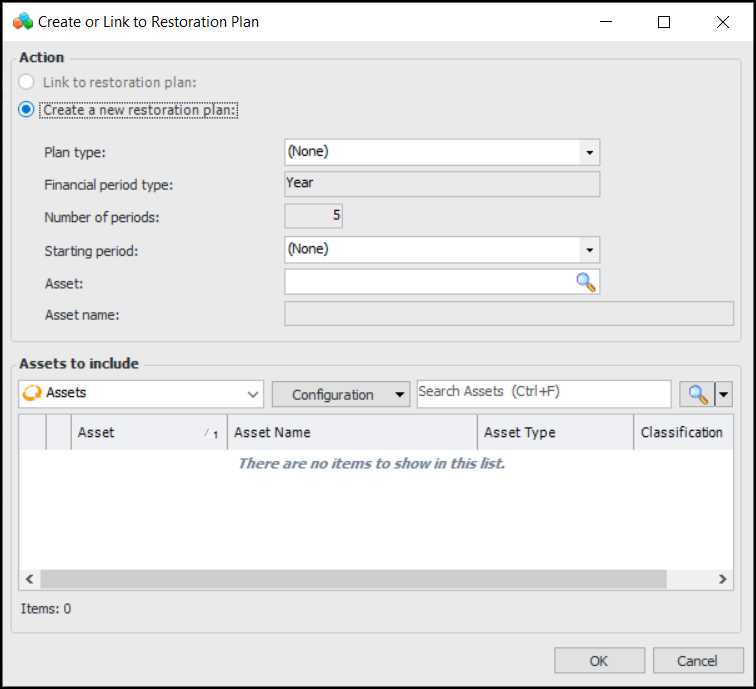 For information about starting with the condition analysis and creating or linking to a restoration plan, see Creating an Asset Restoration Plan from an ACA.To Create an Asset Restoration Plan from Scratch
