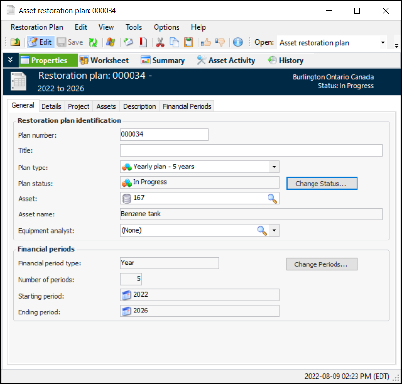 11. Select the Details tab to record the planned start and completion date for the planning process. You can also select the operating context for the asset as it relates to restoration planning.