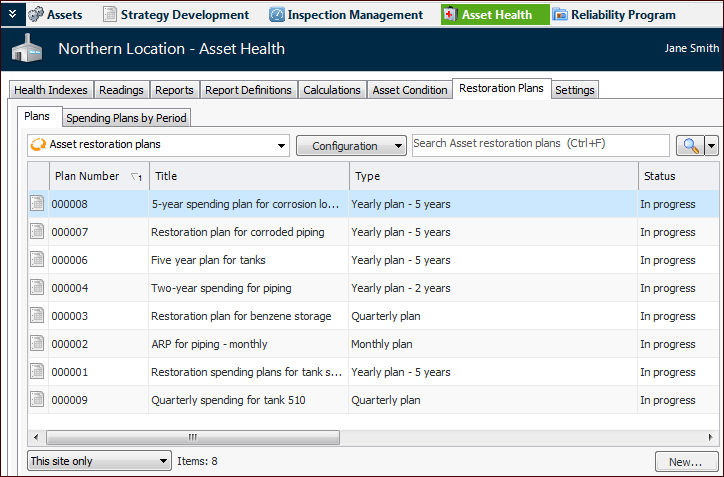 1. Select the Asset Health view on the Site or Asset window and then the Restoration Plans tab. This tab lists existing plans, for example: