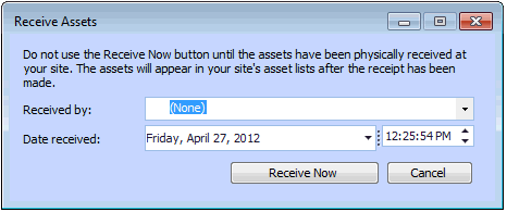 4. Click Receive Now. When the receipt has been processed, APM displays a message saying the assets have been received.