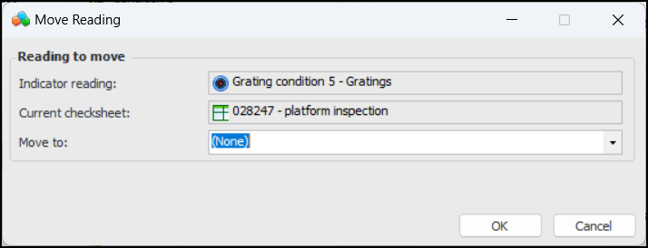 • Move an individual indicator reading to a different checksheet. Right-click the reading in a list and click Move to Another Checksheet.The Move to list shows only checksheets in the same checksheet grouping.