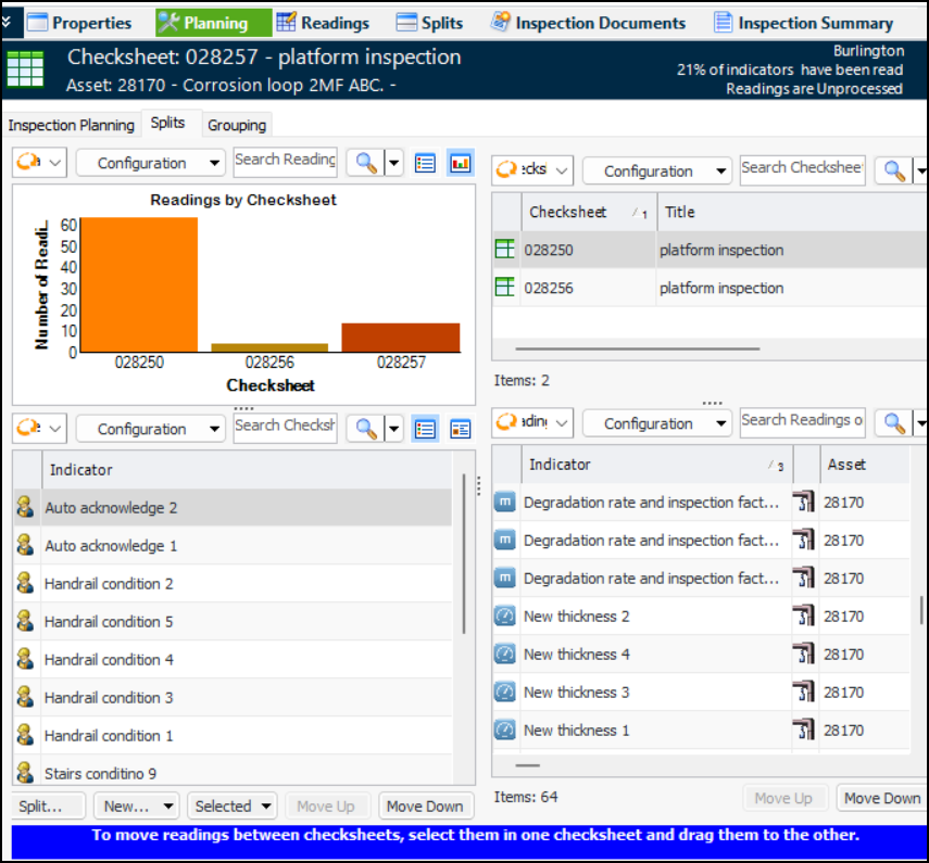 • When a checksheet has been split, the two (or more) resulting checksheets are numbered individually, but they are also identified by their common checksheet grouping. You can view checksheet groups in the Site window, Inspection Management view, Checksheets tab, Splits tab.