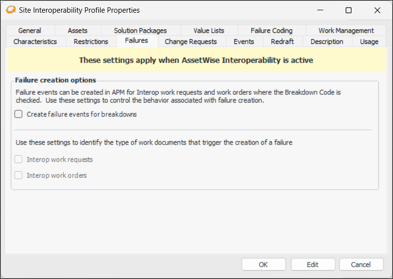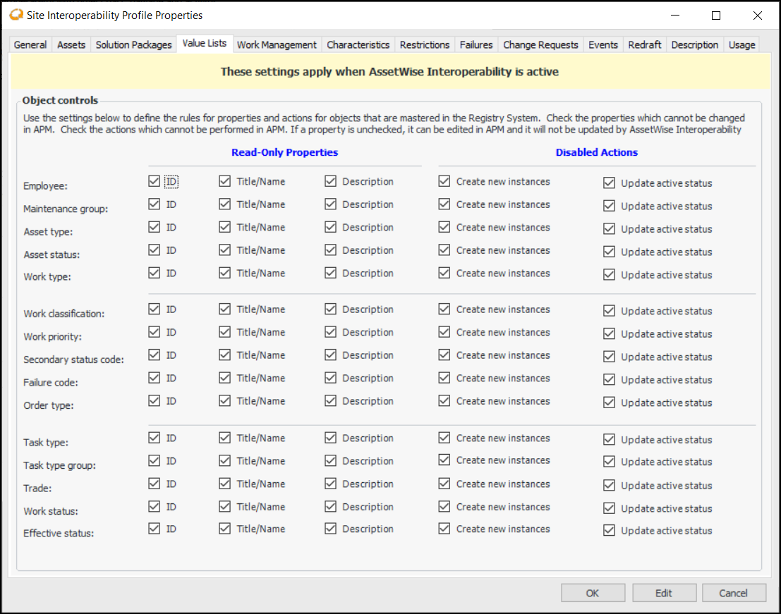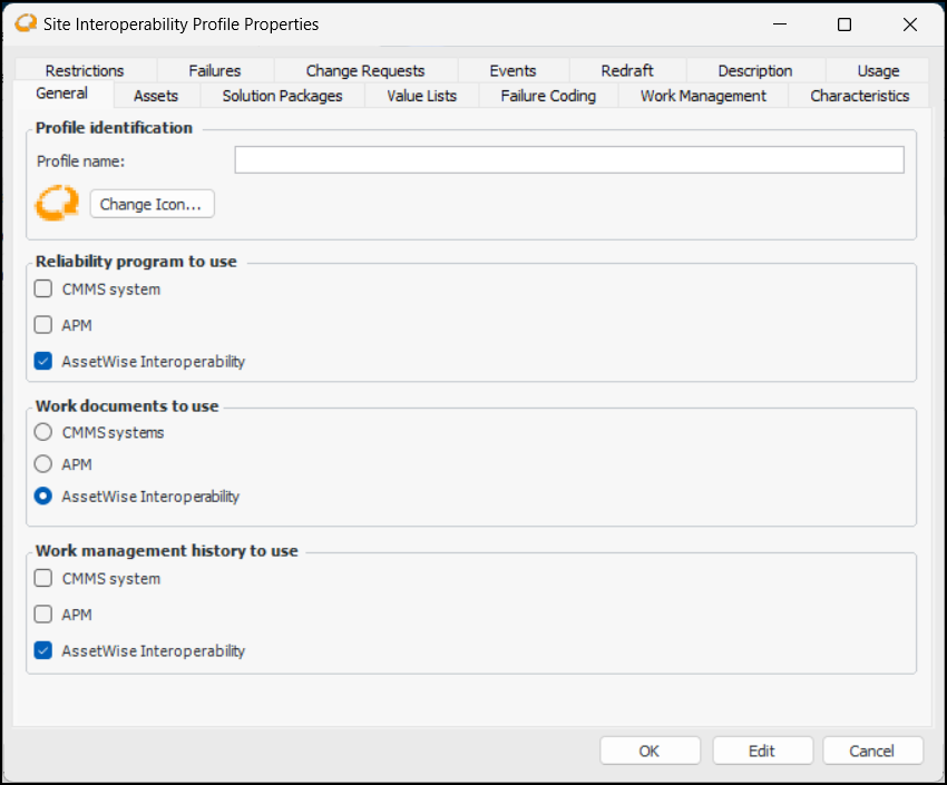 You can assign a profile in the site’s AssetWise interoperability settings. For more information, see Activating AssetWise Enterprise Interoperability in APM.To Create a Profile