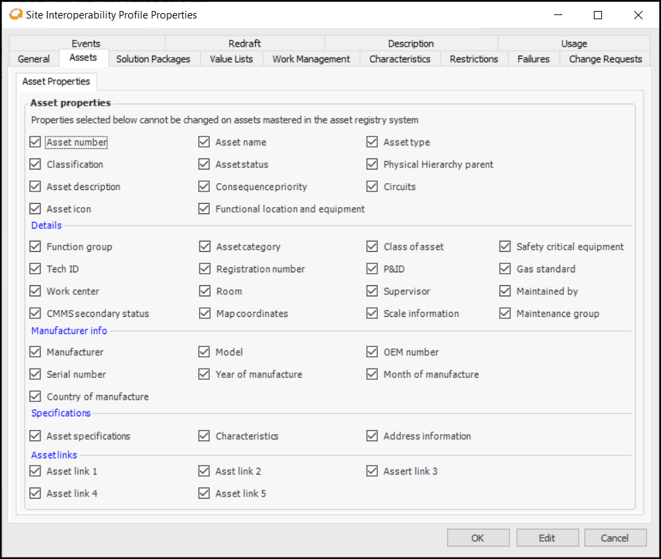 9. Properties that are selected in the Solution package properties area are read-only on solution packages, which means that they can be changed in the CMMS only and will then be updated in APM.