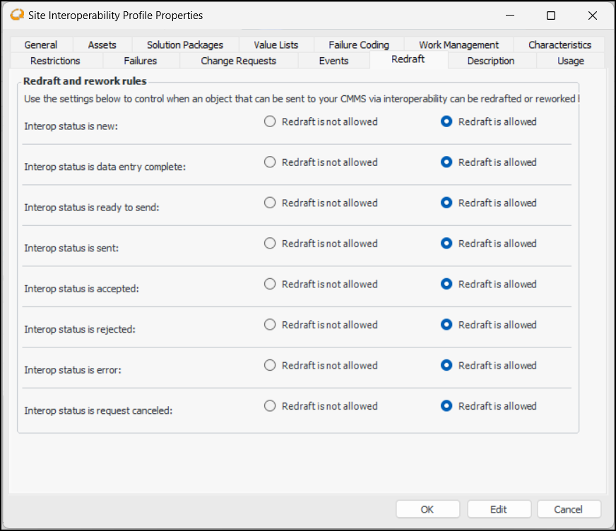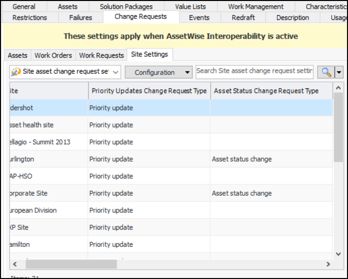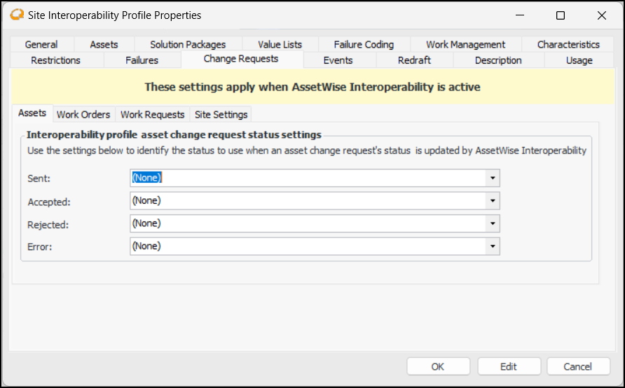2. Select the Assets tab. When an asset change request is sent to the CMMS, AWEIS returns a status and message to APM. Select the asset change request statuses to assign to requests in response to the statuses returned from the CMMS.Note: An asset change request status must reference an Interop status (Accepted, Error, Rejected, or Sent) to be available for selection on this tab. See Setting up Asset Change Request Statuses.