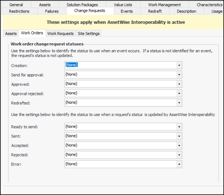6. Select the Work Requests tab and select the change request statuses that correspond to interop events.To Enable Publishing APM Events to AWEIS
