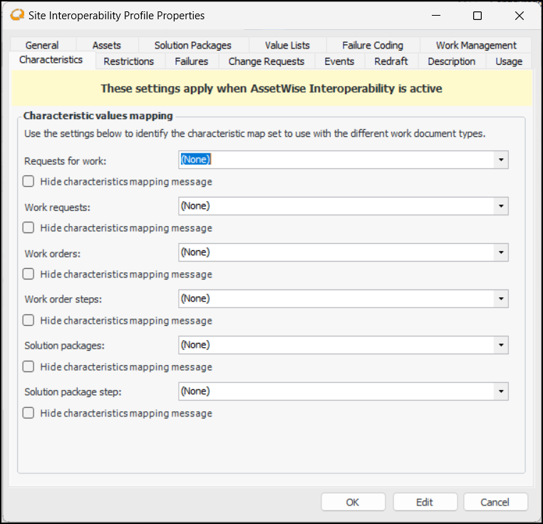 1. Select the Characteristics tab:If this step is missed, a message is displayed in the work documents’ Characteristics tabs in APM. For example, if a map set has not been selected for requests for work, in all Request for Work windows, the Characteristics tab displays a message in the banner, as well as the Edit Settings button. Using the settings dialog, you can select the map set. If needed, you can define characteristic classes, add characteristics, and select default characteristic classes for sites using this dialog.