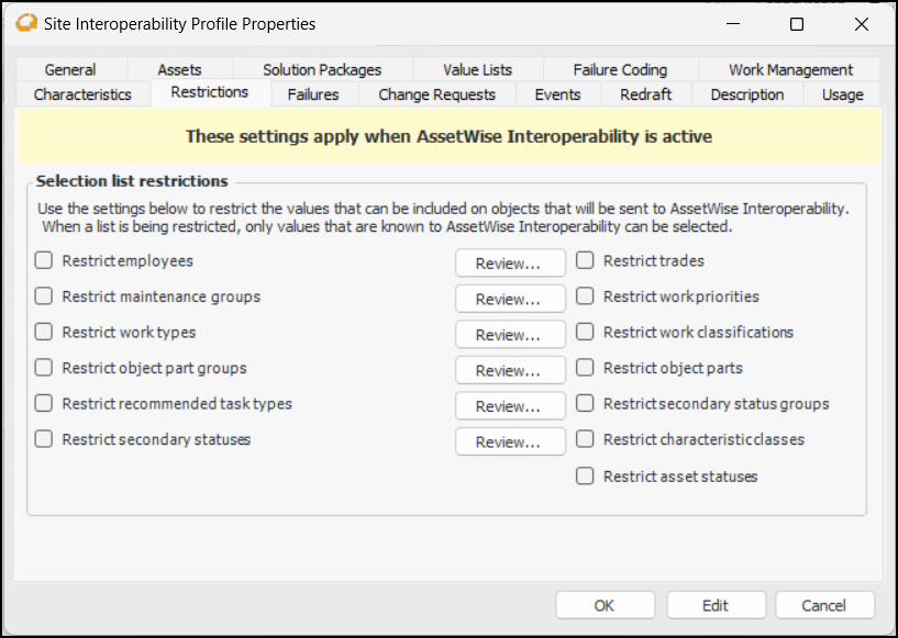 1. Select the Restrictions tab.Tip: Click Review for any value type to see items that are – or are not – enabled for interoperability. For example:To Set Failure Creation Options
