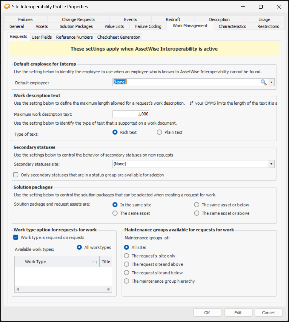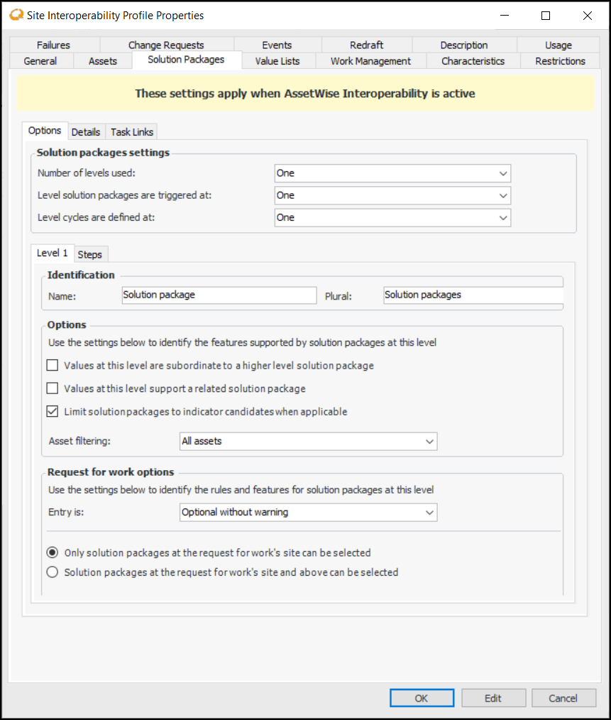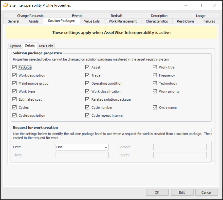 10. In the Request for work creation area, identify the level to use a request for work is created from a solution package.