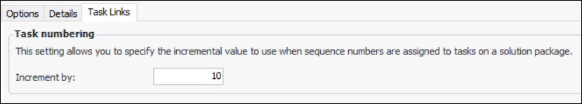 11. Select the Task Links tab. Specify the incremental value to use when numbering tasks as they are added to a solution package. For example:To Set up Failure Coding