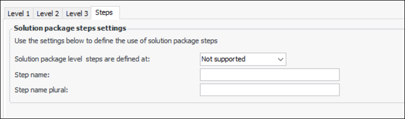 2. Select the number of solution package levels that will be used at the site, from “One” to “Four”. A Level tab is added for each additional level. For example, if you choose to use four levels, Level 2, Level 3, and Level 4 tabs are added so that you can specify options for each level.
