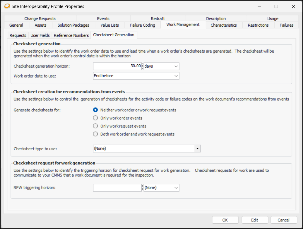 16. In the Checksheet creation for recommendations from events area, specify the interop work documents, if any, for which checksheets can be generated. The work document must be included in a request for work’s events, and the work document’s activity code or failure code must support checksheet generation. Possible values are: