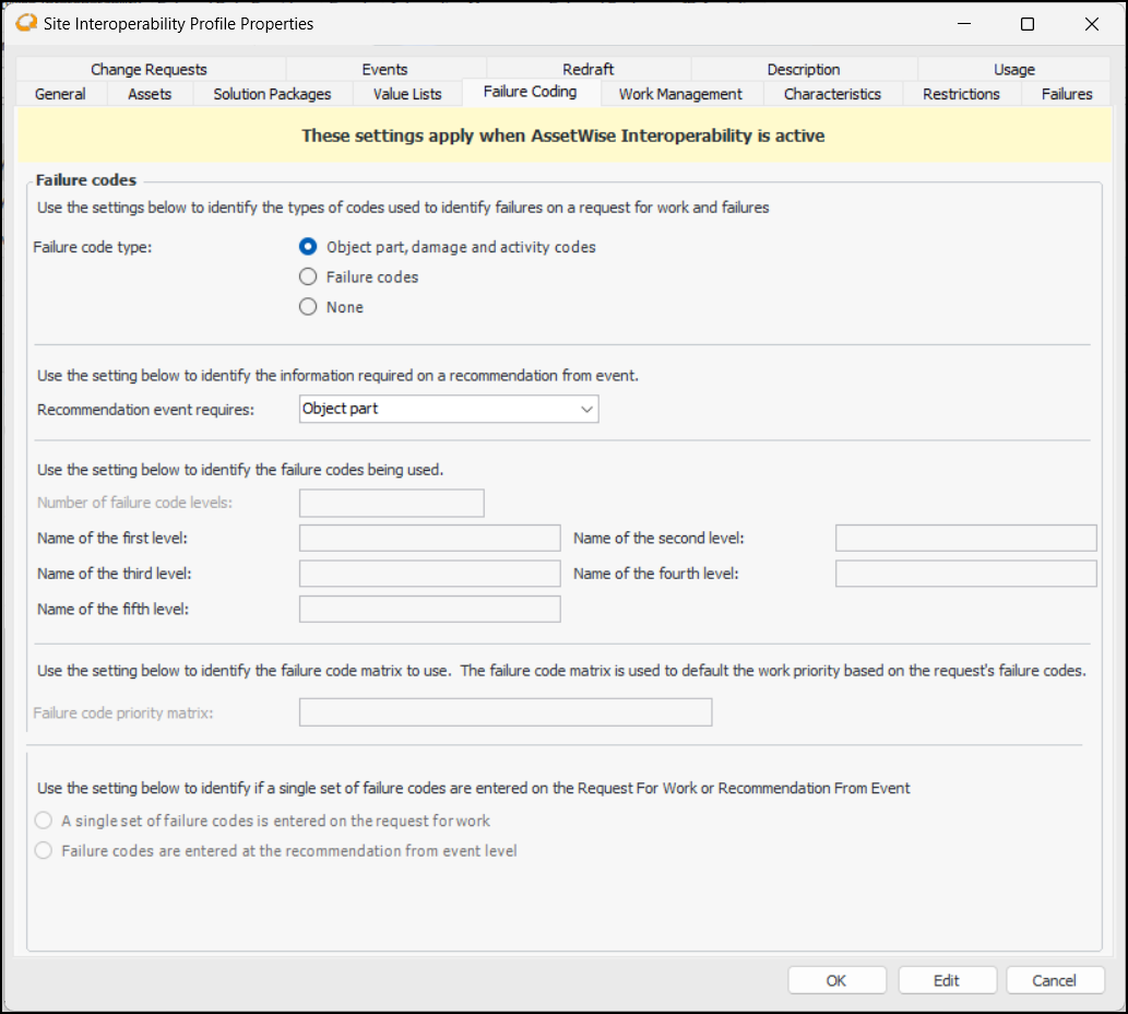 6. If you selected Failure codes, select whether failure codes are selected on the request for work or at the recommendation from event level.To Set Work Management Options