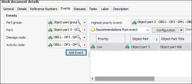 • Object part, damage and activity codes – For example, when acknowledging an indicator alarm with a request for work, you can add one or more recommendations for events to the request. Each event can be defined by a part group, part, damage code, and activity code