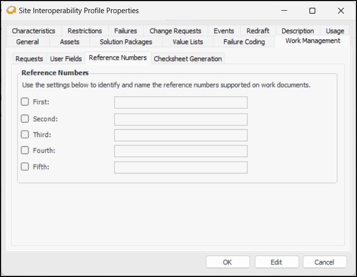 12. Select the Reference Numbers tab:Tip: To send reference number values to the CMMS, be sure to set up characteristic map sets for work documents. See Setting up Characteristic Mapping for Interop Work Documents.